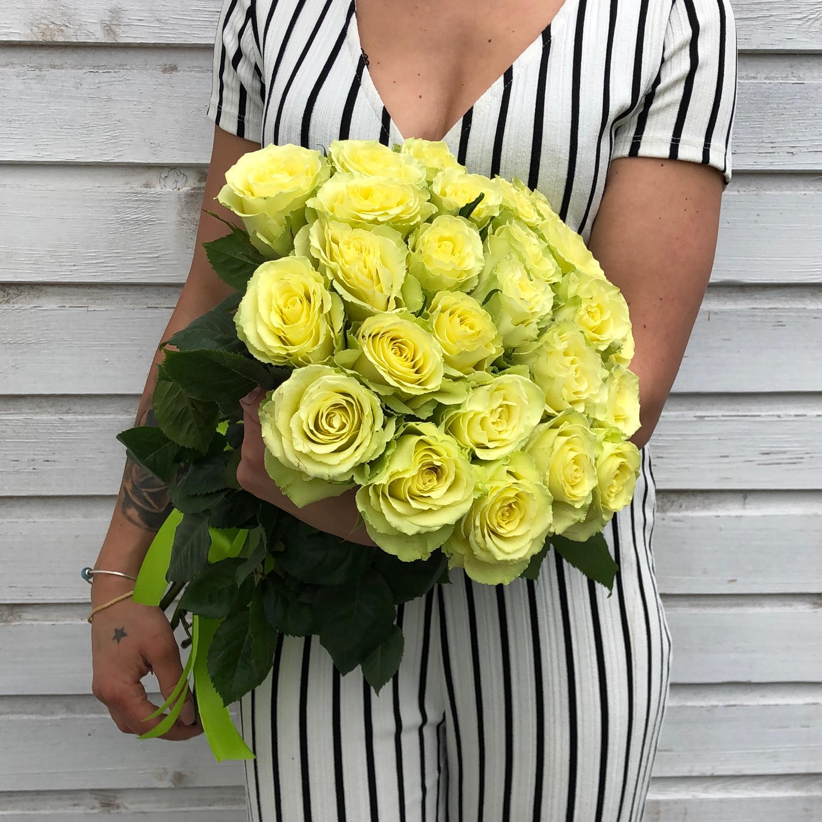 Wskazówka od naszego florysty: Żółte róże przepięknie prezentują się w prostym, przezroczystym szklanym wazonie, który nie konkuruje z ich radosną barwą. Postaw je w jasnym miejscu w domu lub biurze, a natychmiast rozświetlą całe pomieszczenie i dodadzą mu energii!